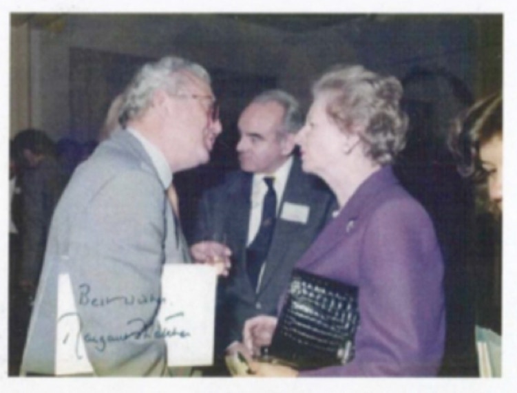 Bruce Kemble makes a point to Mrs Thatcher who has written her best wishes on the pic